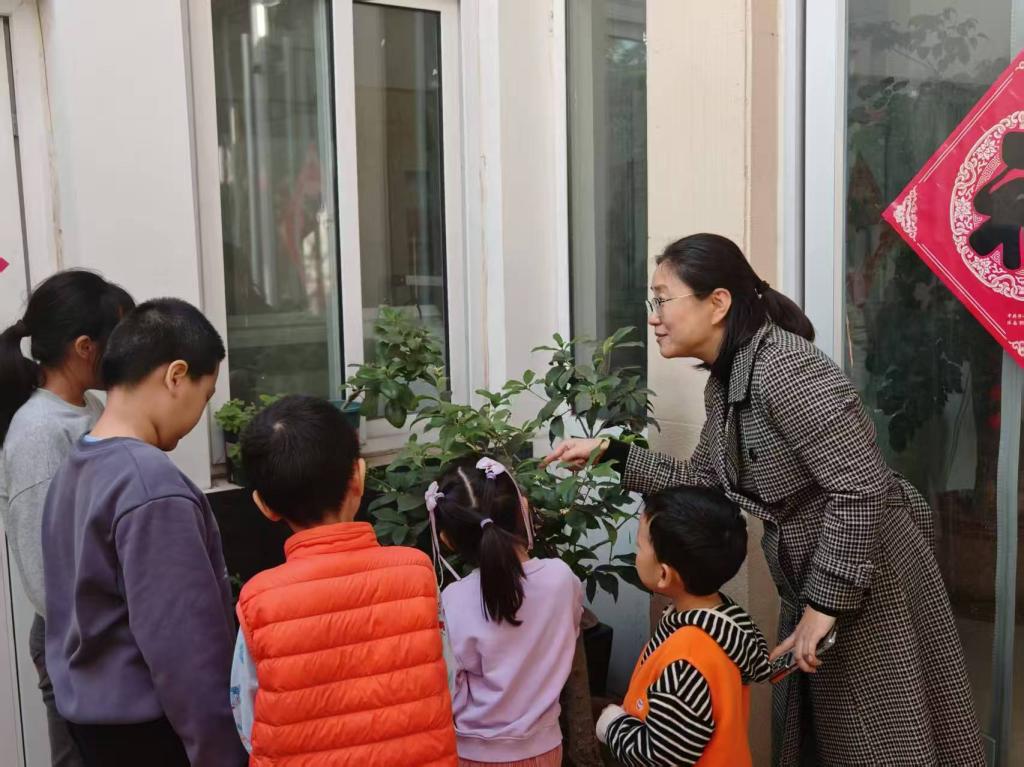 活动伊始,指导教师李秀娟为孩子们讲解了“霜降”节气的物候特征、农事活动与民俗文化,并引导孩子们思考秋天的多彩与丰富。李老师带领孩子们走进社区小花园,实地观察植物的形态与颜色,孩子们轻嗅花香,仔细观察,踊跃提问有关植物习性与节气变化的问题。李老师鼓励孩子们调动感官,用心观察自然,积累写作素材,感受生活中的诗意。