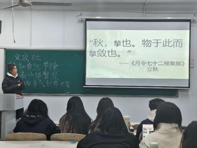 文宬社负责的宣讲赛道以“文化解读+语言表达”为核心,参赛选手围绕单个或多个节气展开5分钟的PPT宣讲,内容涵盖节气起源、物候特征、地域民俗及文化典故等核心板块,逻辑清晰且重点突出。活动现场,有同学结合《月令七十二候集解》,从“立春三候”讲到“冬至数九”,系统梳理节气背后的天文历法与农耕智慧;还有同学聚焦地方民俗,分享清明踏青、冬至吃饺子的地域特色习俗;更有选手以诗词串联四季,从“春眠不觉晓”的惊蛰生机到“霜叶红于二月花”的霜降意境,让听众在视听盛宴中读懂古人“天人合一”的生存哲学。