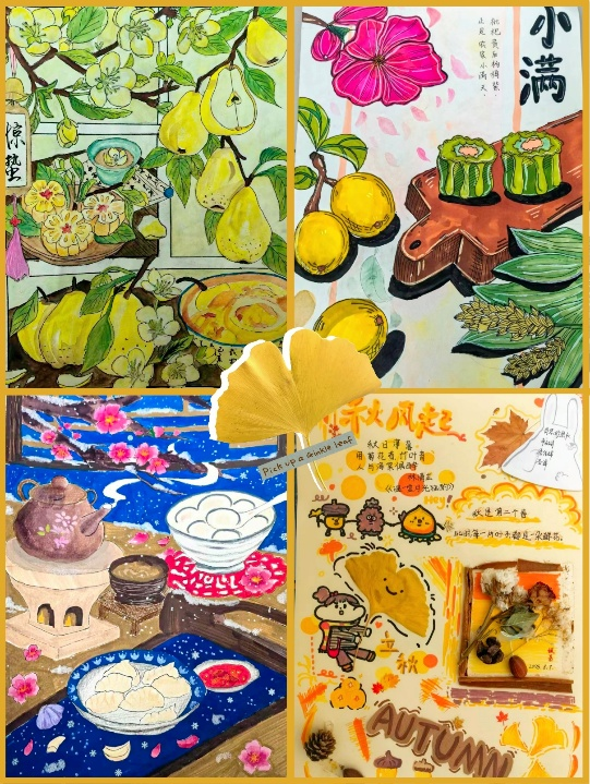由明德书画社负责的手工制作赛道同样亮点纷呈,同学们以任意节气的文化特征、物候景象或民俗元素为创作核心,解锁了多元创意表达。作品形式既有毛笔书写古朴苍劲的节气谚语、水彩画勾勒的“霜降寒菊”物候图景等传统书画作品,也有剪纸作品“小满麦穗”的灵动鲜活,布艺香囊绣满节气纹样,手账作品则用图文记录节气习俗与生活感悟,每一件作品都凝聚着同学们对传统民俗的热爱与动手实践的巧思。