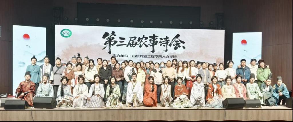 2025年11月29日,山东农业工程学院人文学院主办的第三届农事诗会在淄博校区大学生活动中心精彩上演。作为我院文化育人“名牌”活动,本次诗会以“节令长歌·诗韵稼穑”为核心,将二十四节气与农耕深度融合,通过多元艺术形式演绎古今农耕故事,让“天人合一”的生态智慧与“耕读传家”的文化基因落地生根,生动诠释了学校“农”字当头的育人理念。