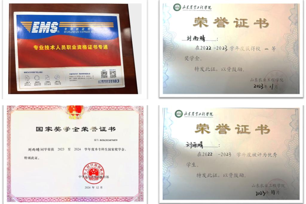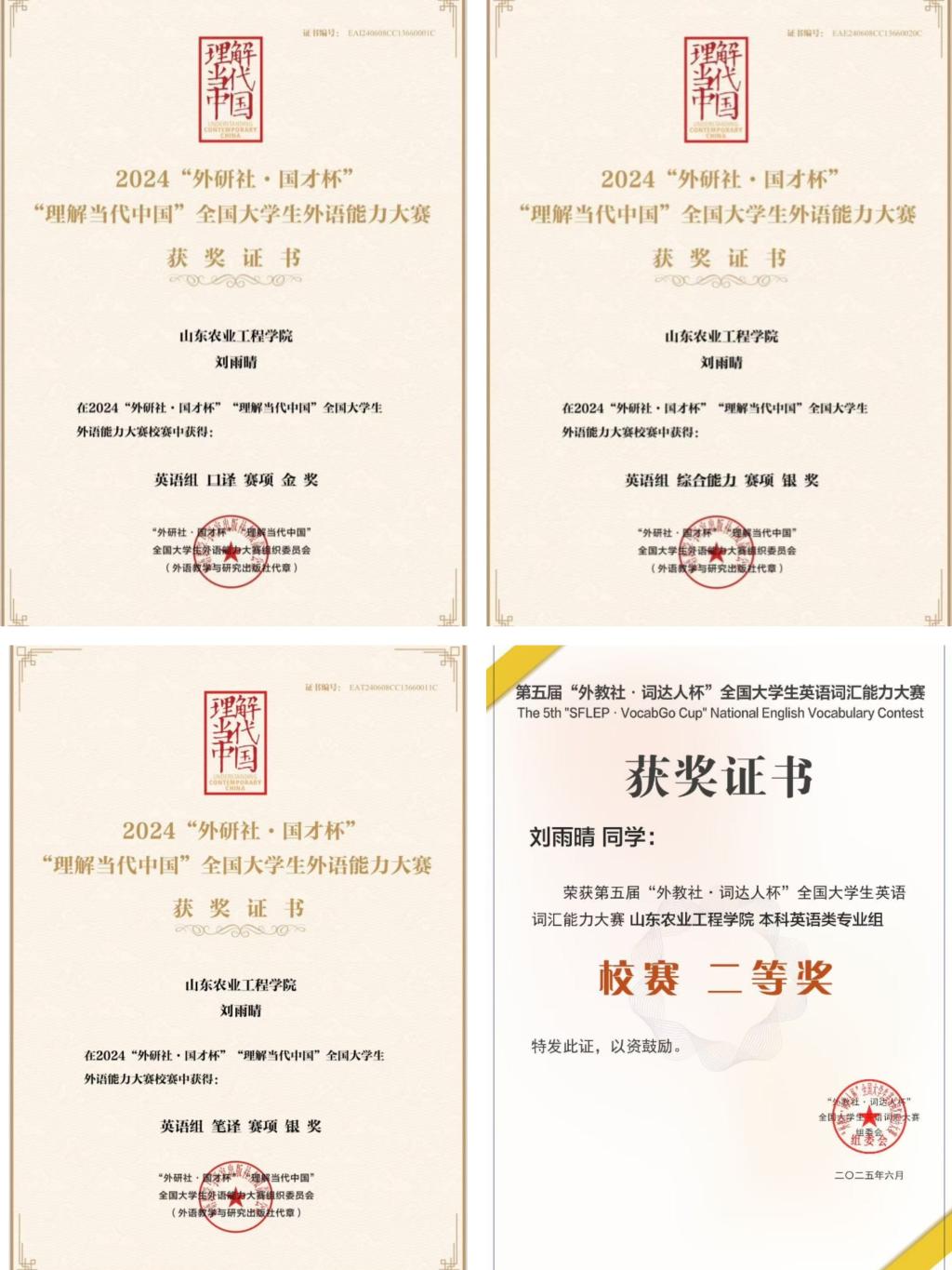 她思想上进、目标明确,始终以严谨专注的态度深耕专业领域,综合考评居专业第一。同时,她主动拓展技能边界,成功考取高级英语教资、三级笔译、英语导游、计算机二级等多项含金量十足的证书,用实干践行“全面发展”的成长理念。凭借扎实的学业表现,她连续三年获评校级优秀学生,连续两年斩获校级一等奖学金,连续两年荣获国家奖学金,成为同学们眼中的学业典范。