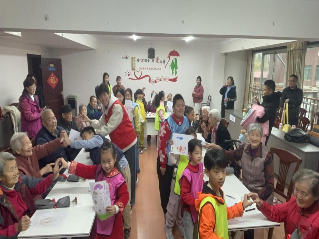 短暂的休憩后,“健康食光·营养小课堂”开讲。志愿者们以通俗易懂的语言,为老人科普了适合秋冬的饮食搭配与养生小技巧。最动人的“时光画笔·听爷爷奶奶讲‘了不起’的故事”环节里,孩子们用画笔勾勒重阳图景,老人们则缓缓讲述自己人生中难忘的经历——从青春岁月的奋斗往事到对晚辈的殷切嘱托,代际距离悄然消融。最后,参与者合唱了《东方红》与《童年》,经典旋律与童真歌谣交融,歌声里满是跨越年龄的温情共鸣。