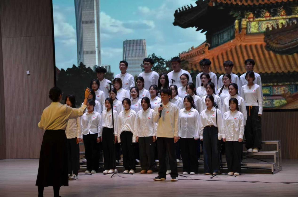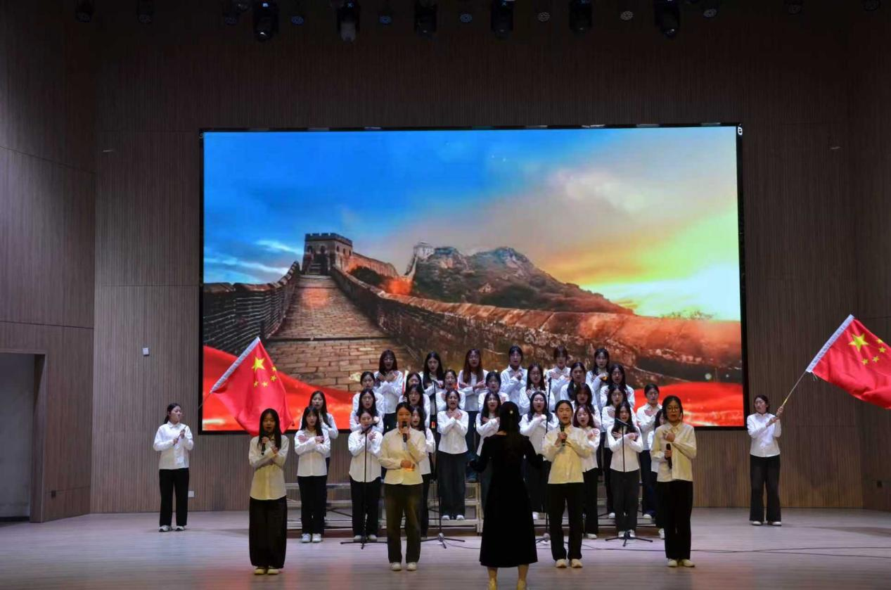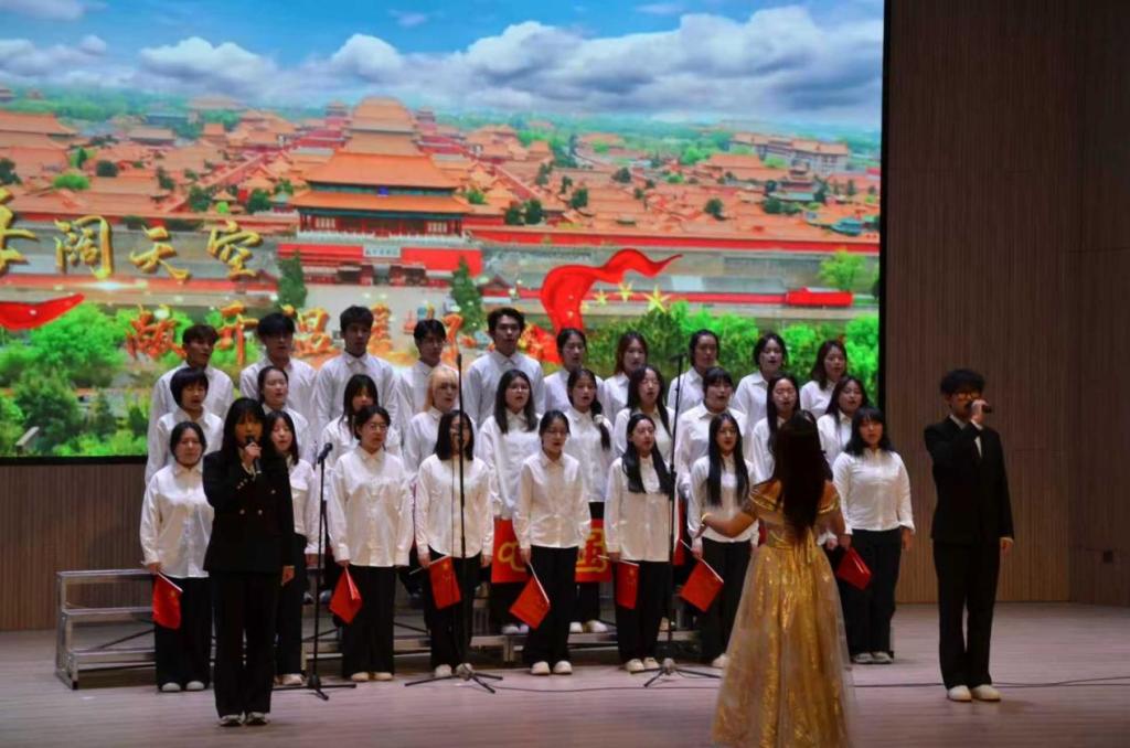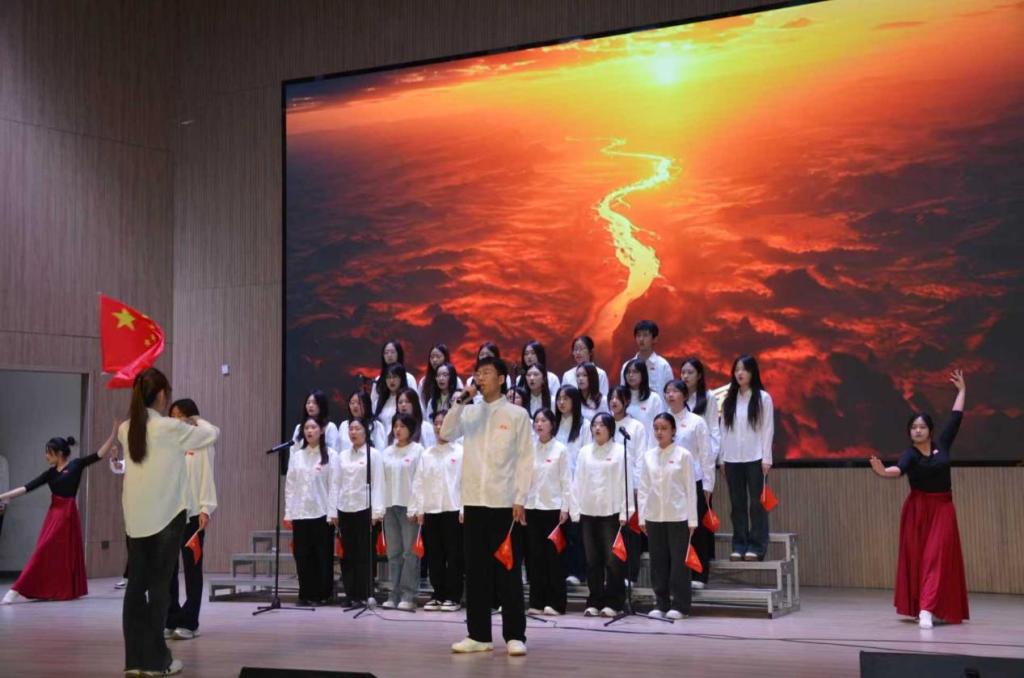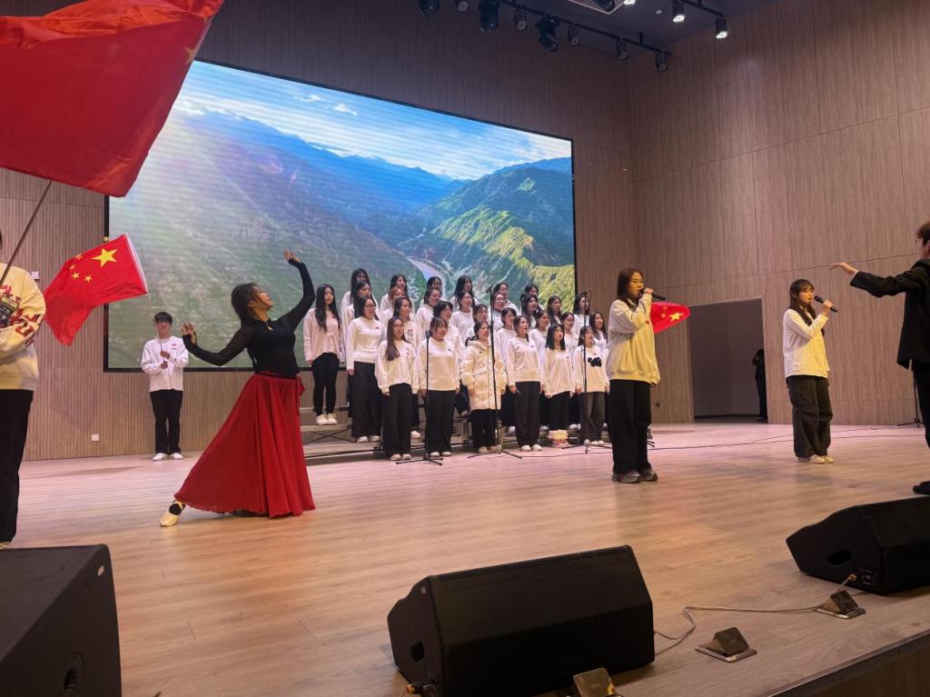 之后,同学们歌唱《一起向未来》,青春嗓音将奔赴未来的热忱随旋律漫溢全场。学子们唱响《歌唱祖国》,女生舞步轻盈相伴,同学们手中的五星红旗随旋律有力挥动,展现爱国情怀。身着统一定制服饰的学子们唱响《紫荆花盛开》,一位同学躬身时,经同伴殷殷呼唤归队,恰如香港回归祖国怀抱的深情隐喻;当旋律衔接至《我和我的祖国》,六位身着民族特色服装的同学缓步从红幕走出,纵使语言各异,却以同一份对祖国母亲的挚爱,汇成全场齐声呐喊的心声——“我和我的祖国”,歌声随之激昂绽放。《我们都是追梦人》歌声积极昂扬,红底白字映誓言,学子齐呼两遍“请党放心,强国有我。”身着统一服饰的学子以深情朗诵开篇,同学们手中灯光簇拥映照在中央由镰刀锤头组成的党徽上,随后齐声唱响《新征程》,让奋进旋律与信仰之光交织共鸣。学子们合唱《少年中国说》,字字铿锵间尽抒家国担当,将青春炽热与理想壮阔融于激昂旋律。最后商学院梵树乐队的马雅欣同学为大家带来《倒带》歌曲。