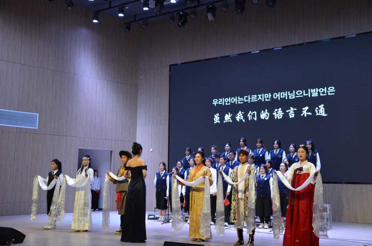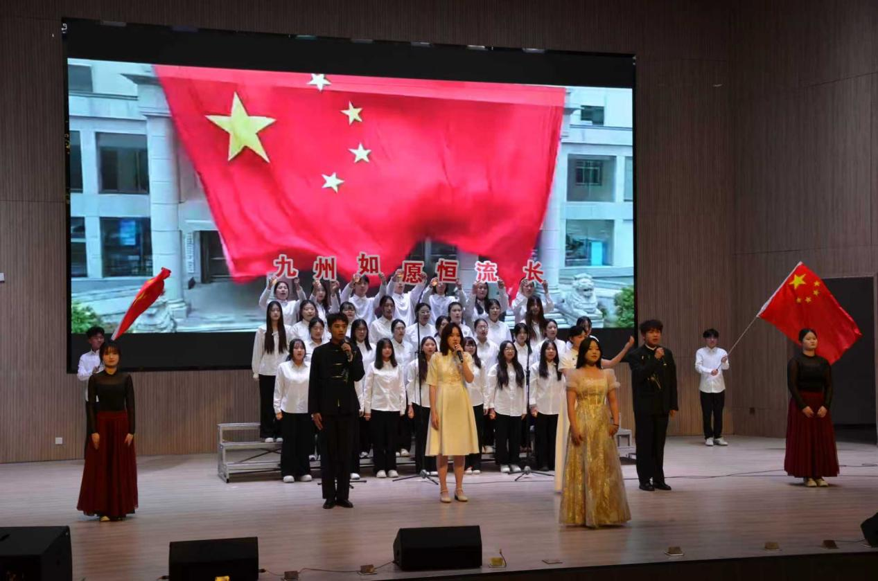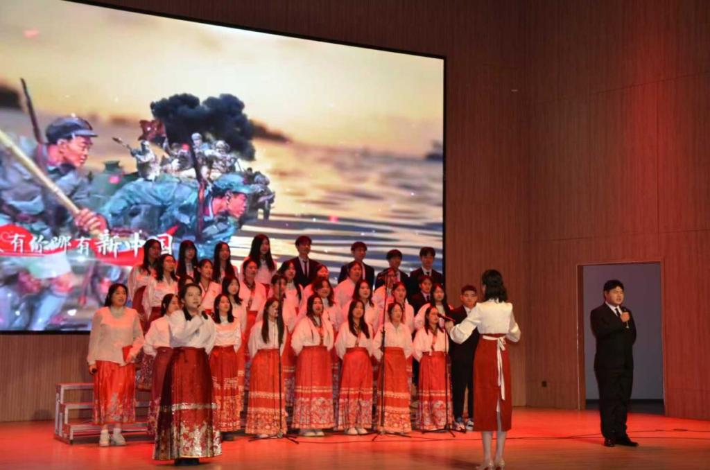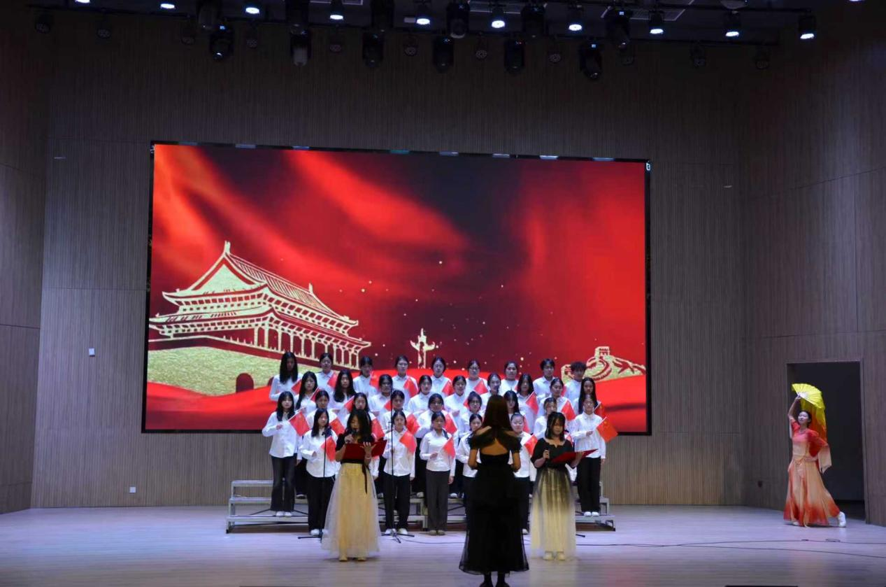 之后,同学们歌唱《一起向未来》,青春嗓音将奔赴未来的热忱随旋律漫溢全场。学子们唱响《歌唱祖国》,女生舞步轻盈相伴,同学们手中的五星红旗随旋律有力挥动,展现爱国情怀。身着统一定制服饰的学子们唱响《紫荆花盛开》,一位同学躬身时,经同伴殷殷呼唤归队,恰如香港回归祖国怀抱的深情隐喻;当旋律衔接至《我和我的祖国》,六位身着民族特色服装的同学缓步从红幕走出,纵使语言各异,却以同一份对祖国母亲的挚爱,汇成全场齐声呐喊的心声——“我和我的祖国”,歌声随之激昂绽放。《我们都是追梦人》歌声积极昂扬,红底白字映誓言,学子齐呼两遍“请党放心,强国有我。”身着统一服饰的学子以深情朗诵开篇,同学们手中灯光簇拥映照在中央由镰刀锤头组成的党徽上,随后齐声唱响《新征程》,让奋进旋律与信仰之光交织共鸣。学子们合唱《少年中国说》,字字铿锵间尽抒家国担当,将青春炽热与理想壮阔融于激昂旋律。最后商学院梵树乐队的马雅欣同学为大家带来《倒带》歌曲。