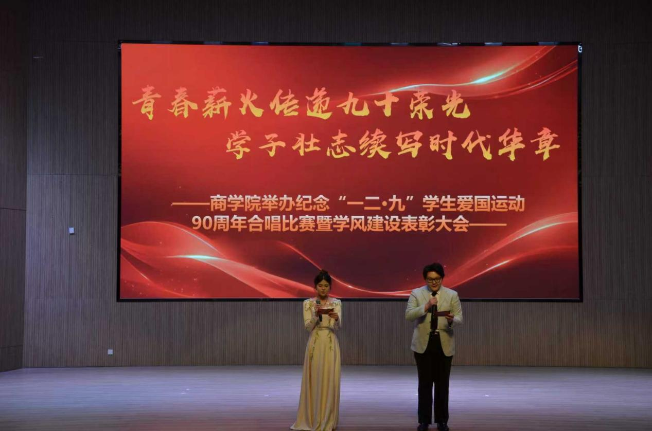 为传承和弘扬“一二•九”精神、厚植家国情怀根基、凝聚班级同心之力,山东农业工程学院商学院于2025年12月8日晚在大学生活动中心报告厅隆重举办纪念“一二•九”学生爱国运动90周年合唱比赛暨学风建设表彰大会。山东农业工程学院商学院党委书记李欣、党委副书记王世辉、商学院团总支全体辅导员、商学院2025级全体同学参与此次活动。活动由周鹤洋、艾孜麦·地里夏提同学主持。