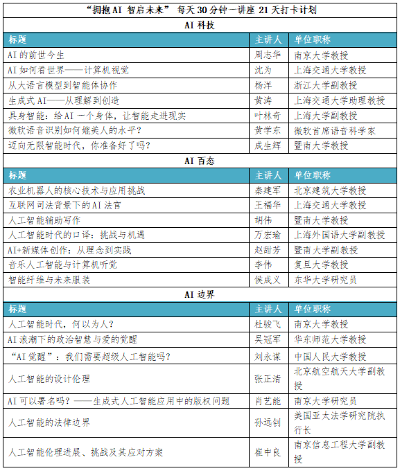 本次打卡活动,汇聚了人工智能及相关领域的行业专家及顶尖学者、专业名师,通过21场干货满满的通识讲座,带大家真正走进AI的智能世界。让我们一同拥抱AI、智启未来。