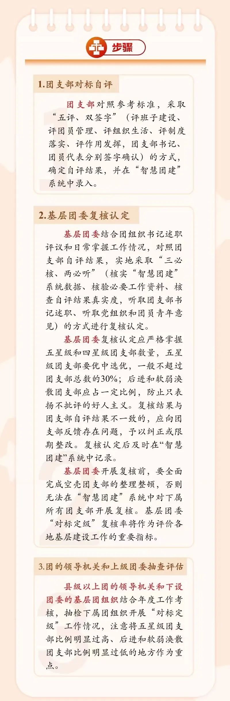县级以上团的领导机关和下设团委的基层团组织结合年度工作考核,抽检下属团组织开展“对标定级”工作情况,注意将五星级团支部比例明显过高、后进和软弱涣散团支部比例明显过低的地方作为重点。