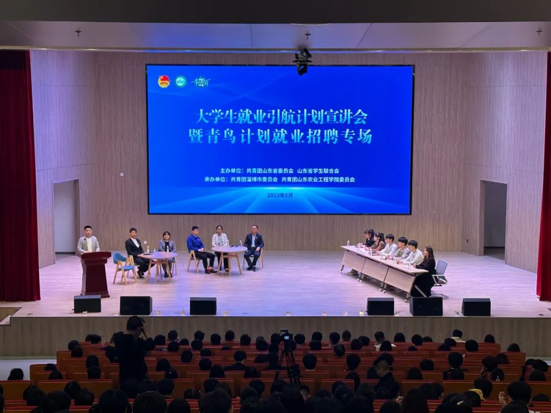 为深入贯彻落实党的二十大精神,扎实推进学习贯彻习近平新时代中国特色社会主义思想主题教育,引导大学生树立理性、平实的择业观、就业观,主动到基层一线“自找苦吃”、奋斗成才,5月7日下午,由共青团山东省委、山东省学生联合会主办,淄博团市委、山东农业工程学院团委承办,山东农业工程学院学生工作部协办的山东省大学生就业引航计划宣讲会暨青鸟计划就业招聘专场活动在我校淄博校区举行,来自山东理工大学、淄博职业学院、山东轻工职业学院、齐鲁医药学院和我校的500余名毕业生参加活动。
