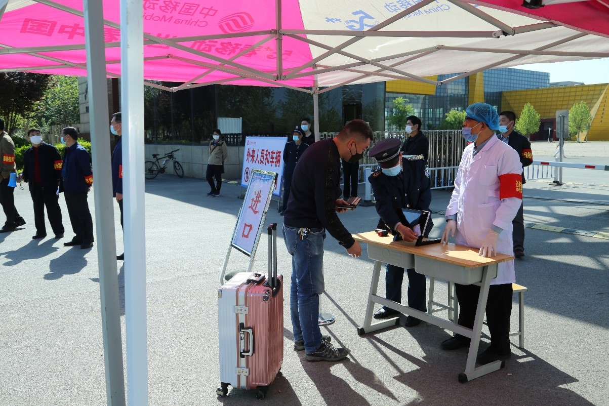 入校模块演练中,安全保卫组人员负责组织学生有序进入学校。入校学生首先到消毒区对足部、手部和行李等进行喷雾消毒,然后到测温区进行体温检测,体温正常的进一步核验身份(主要核验是否是规定时间内报到人员,核验山东电子健康通行卡(码)是否是绿色标识),核验无误后,返校报道注册完成。