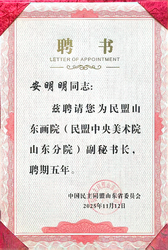 近日,中国民主同盟山东省委员会正式聘任我校艺术学院副院长安明明为民盟山东画院(民盟中央美术院山东分院)副秘书长,聘期五年。此次聘任是民盟山东省委会进一步加强画院组织建设、推动艺术事业持续发展的重要举措。