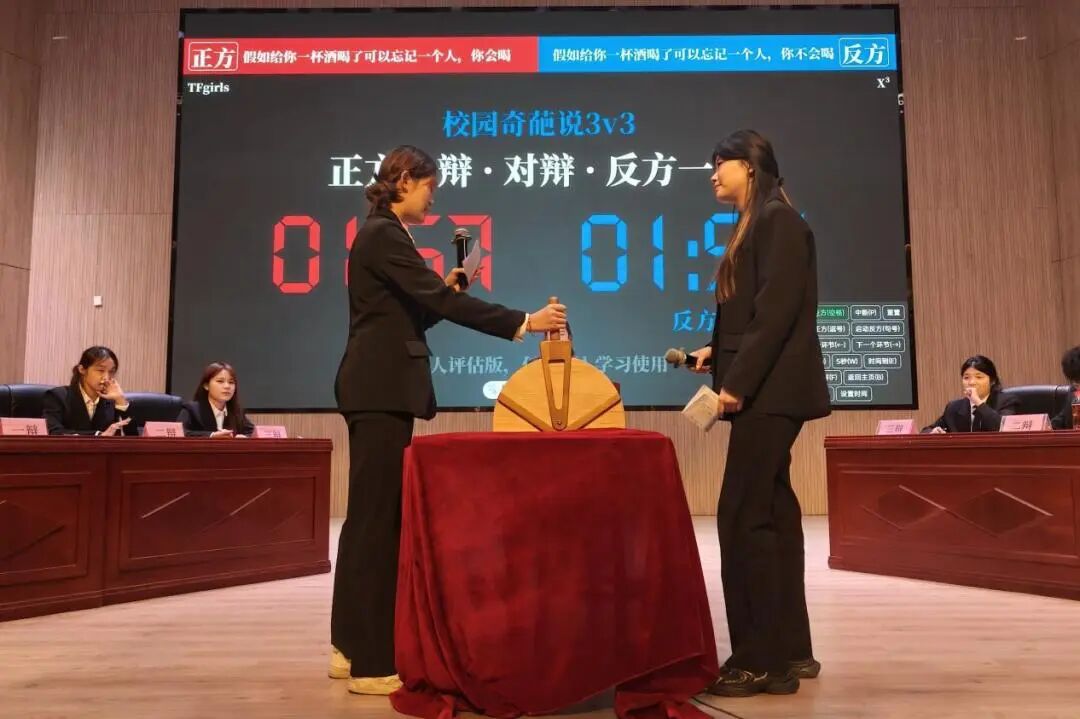 首场围绕“假如有一杯酒可以忘记一个人,你会喝/不会喝”展开。正方“TFgirls 队”秉持唯心主义核心立场,将这杯酒定义为自我意识主导的精神选择权。反方“x³队”则针锋相对地亮明“不会喝”的态度,他们犀利指出,记忆的重量本就是人生的厚度,那些与特定之人相关的欢笑、遗憾与成长,共同构筑了独一无二的自我。双方时而旁征博引阐释情感哲学,时而聚焦现实剖析人生选择。在自由辩论环节,每一次的观点碰撞都会引发全场观众的热烈共鸣与掌声。