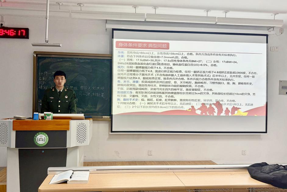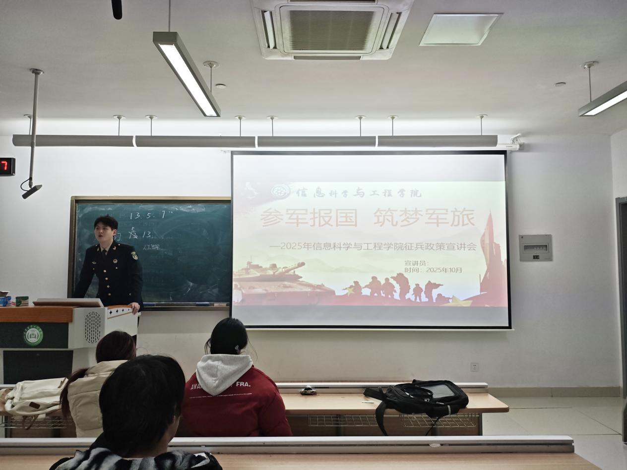 为认真贯彻落实国家征兵政策,激发青年学子参军报国的热情,助力信工学子深入了解国防事业、科学规划军旅人生,信息科学与工程学院于 2025年12月11日在淄公北楼,面向 2025 级信工学子举办征兵政策宣讲会。本次宣讲会由我院优秀退役高校学生士兵担任主讲人。