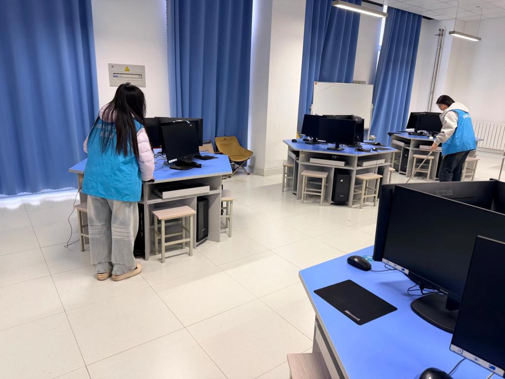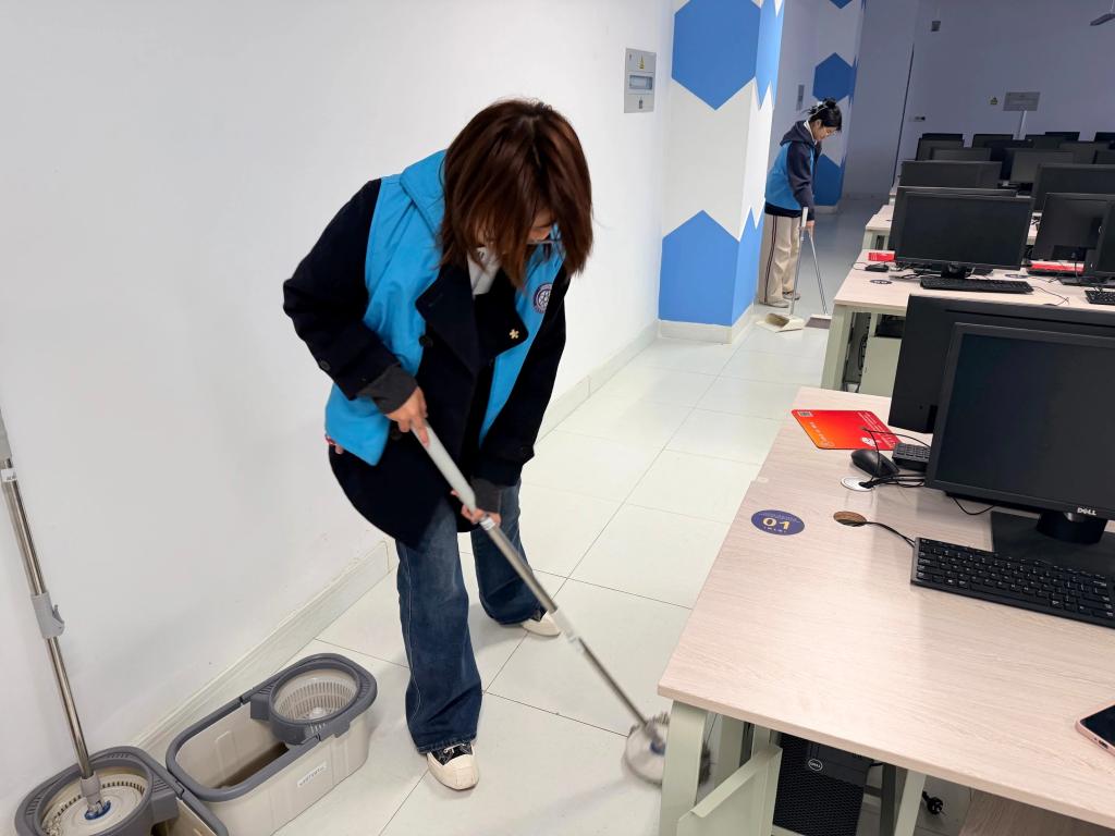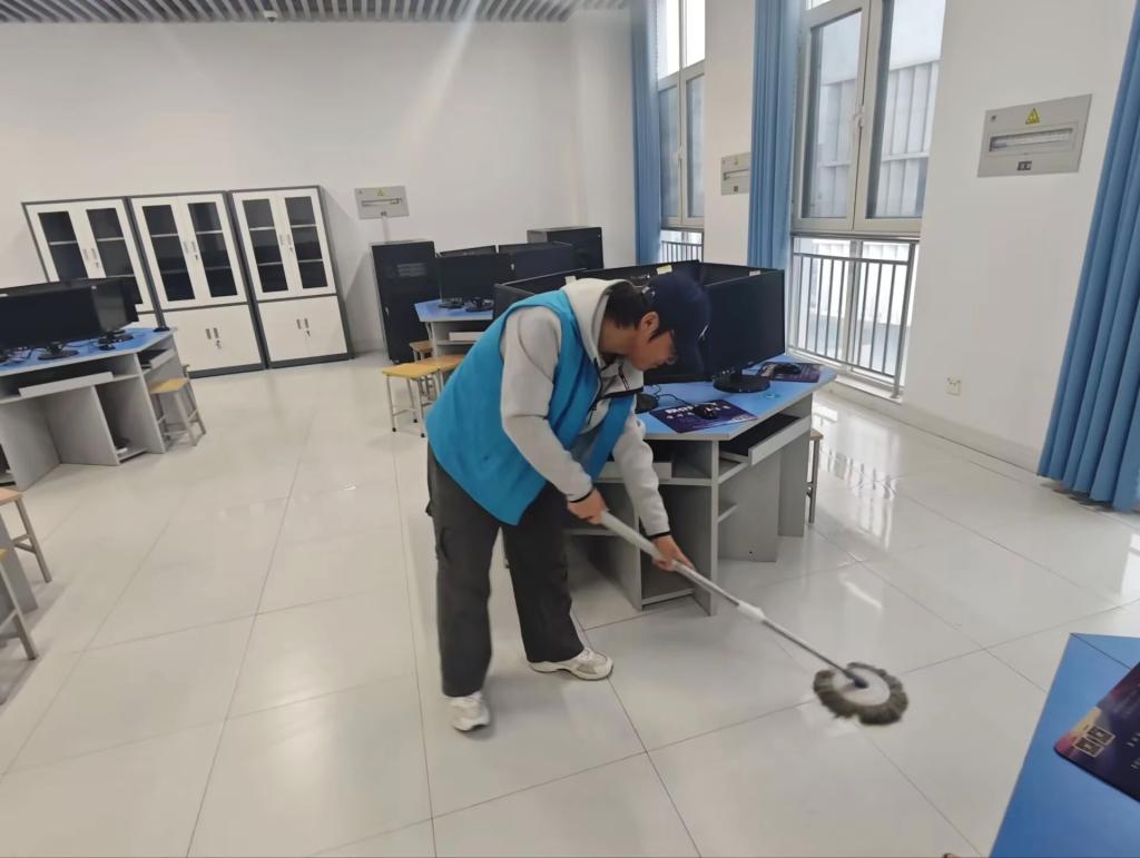 大家分工协作、认真细致,清扫卫生死角,擦拭整理教室桌椅黑板,清理机房卫生并规整线路,以饱满热情高效完成各项清洁任务,成为春日校园中一道靓丽的青春风景线。