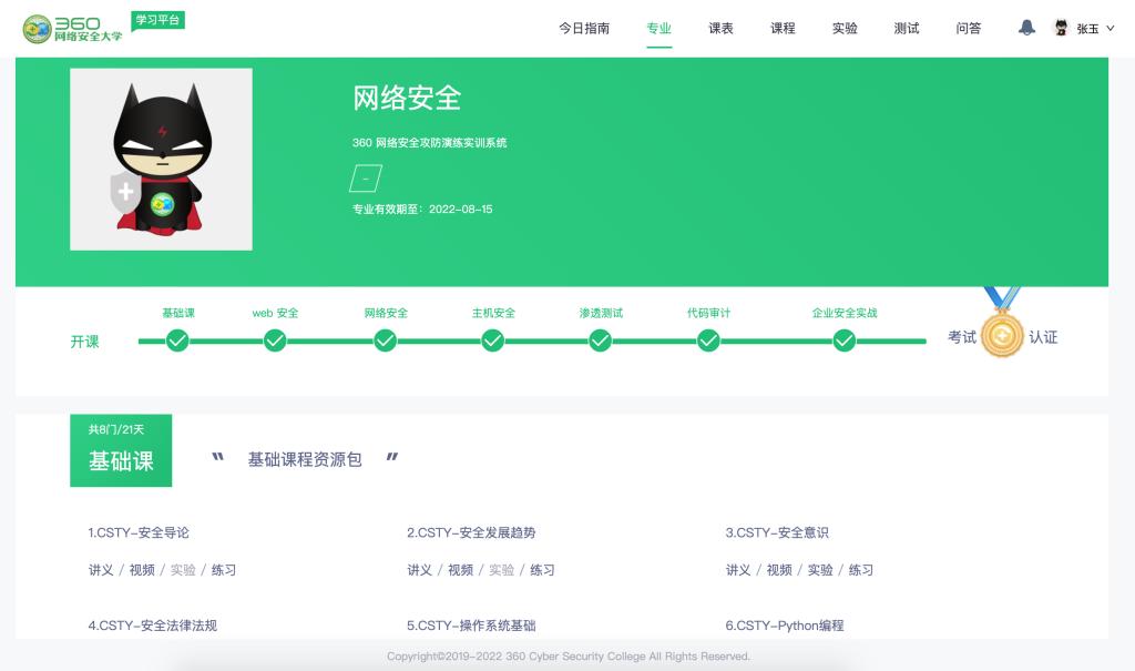 学院网安实践平台采用360攻防演练创新实训平台。该平台以360公司安全大脑为依托,针对态势感知、威胁预警、AI处理分析、智能查条、攻击溯源五大领域,并以此构建标准化课程,全面覆盖网络安全、系统安全、应用安全、数据安全、大数据安全、舆情分析、隐私保护、密码学、安全实战及安全治理等安全课题,提供系统化、标准化、持续更新的安全领域课程体系。