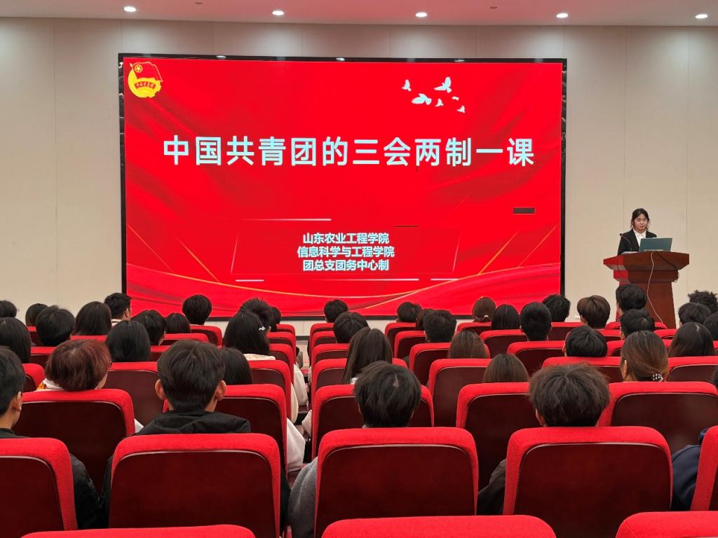 为强化基层团组织建设,夯实团员思想根基,全面提升团员的政治素养与组织意识,2025年10月27日,山东农业工程学院信息科学与工程学院团总支团务中心在文法西楼A104举办“中国共青团的‘三会两制一课’”专题团课。本次团课由学院团务中心王鹤霏主讲,全体入团积极分子参加学习。