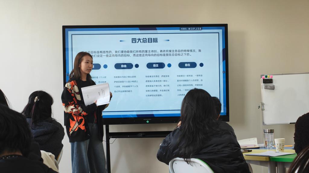 首先,心理中心主任刘妍从沟通姿态、自我认知、心理营养三个角度系统讲解了萨提亚理论的知识,运用案例、小组讨论和分享等方式加深了老师们的理解。刘主任“理论+实践”为核心,分四大篇章层层递进,构建起完整的萨提亚知识体系。
