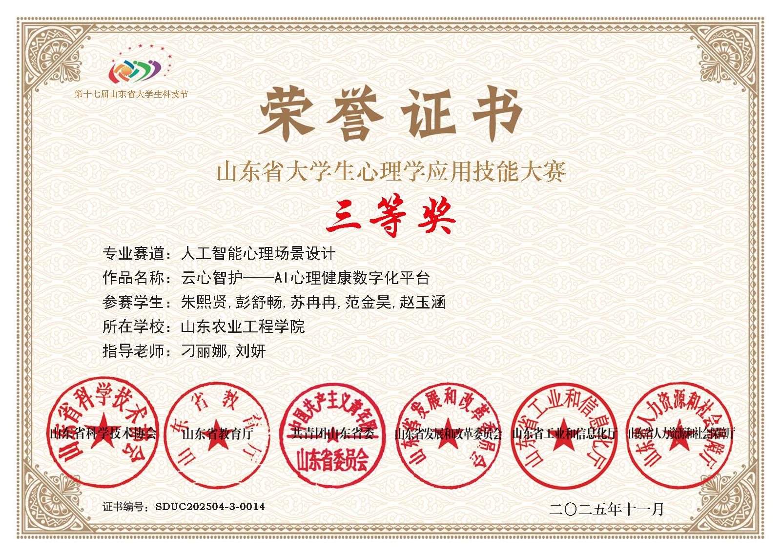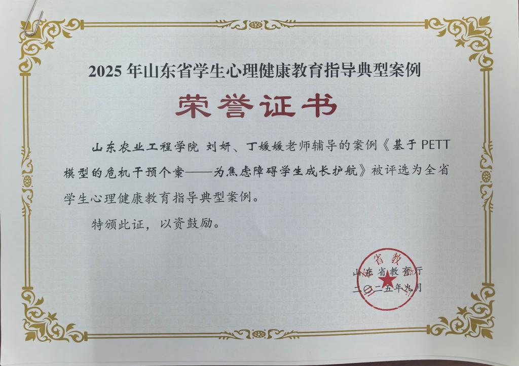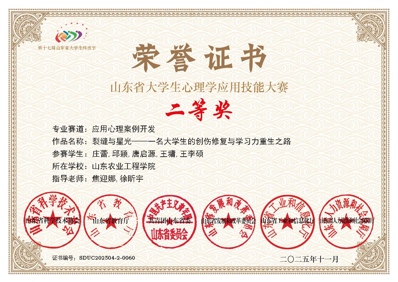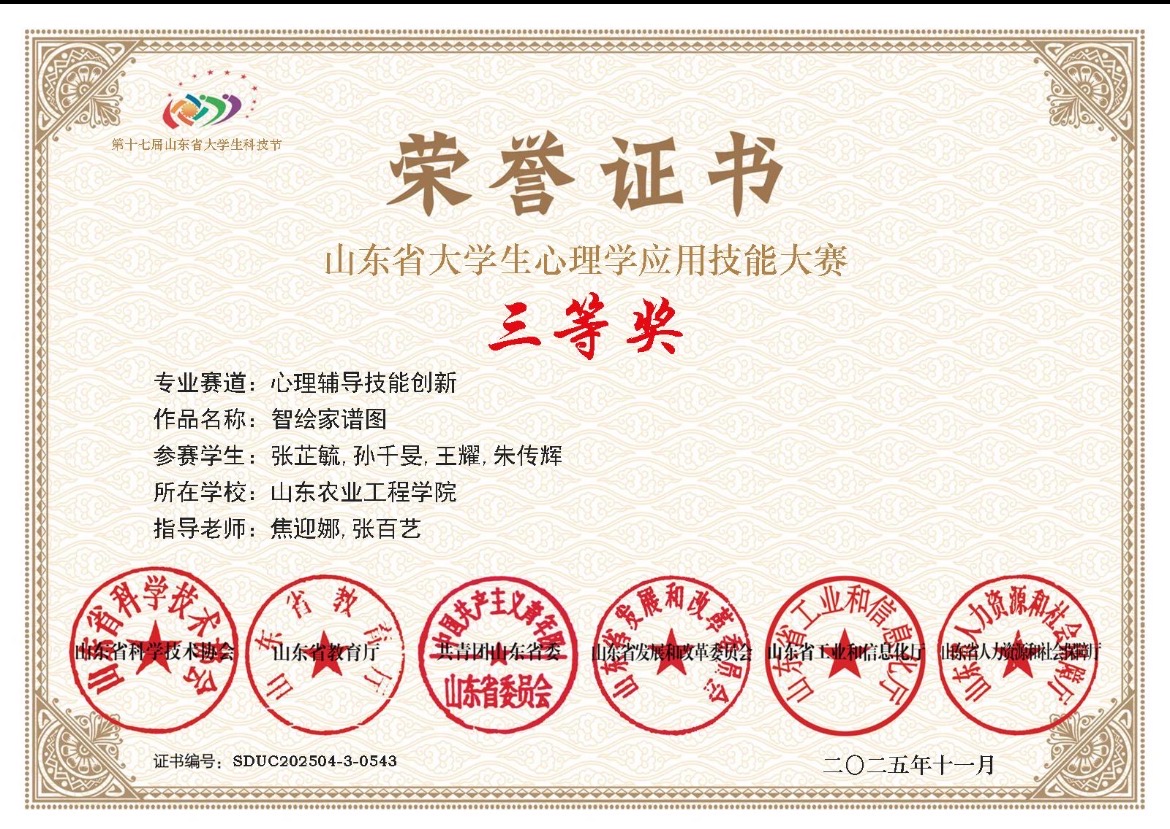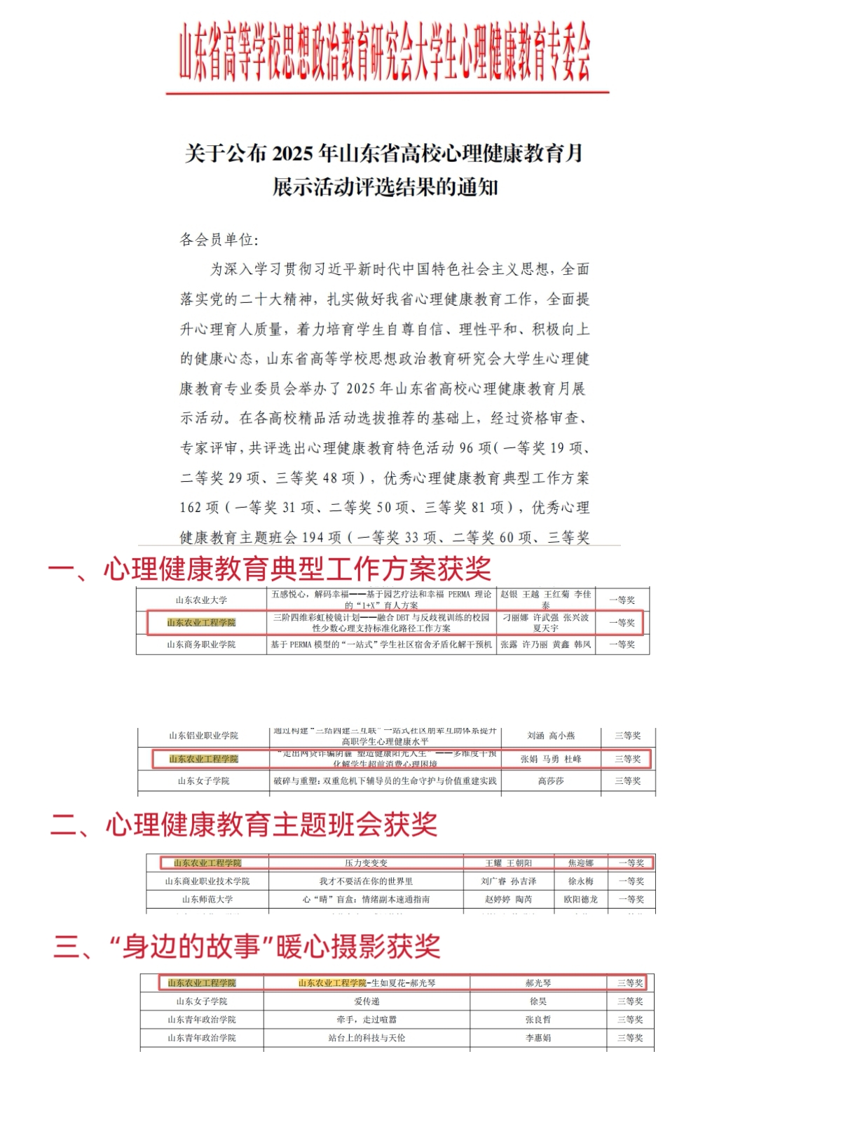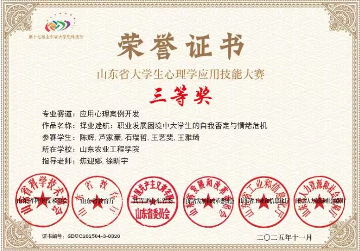 在山东省教育厅主办的山东省学生心理健康宣传教育月系列活动中,我校老师的案例被评为全省学生心理健康教育指导典型案例;在山东省高等学校思想政治教育研究会大学生心理健康教育专业委员会举办的2025年山东省学生心理健康宣传教育月系列活动中,我校师生共计4项作品获奖,包括心理健康教育典型工作方案一等奖1项和三等奖1项、心理健康教育主题班会大赛一等奖1项、“身边的故事”暖心摄影大赛三等奖1项;在第十七届山东省大学生科技节——山东省大学生心理学应用技能大赛中,我校师生获得二等奖1项,三等奖3项。