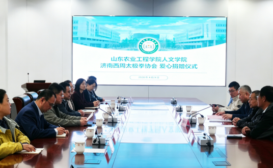 为弘扬中华优秀传统文化,践行社会责任,汇聚社会爱心力量,护航青年学子逐梦前行,4月9日,济南西周太极拳协会爱心捐赠仪式在我校济南校区顺利举行。西周太极拳协会代表、学校党委委员、副校长周吉鹏,党委委员、组织部部长韩娟,离退休工作处处长王辉以及人文学院师生代表出席此次活动,仪式由学生工作部部长陈献锋主持。