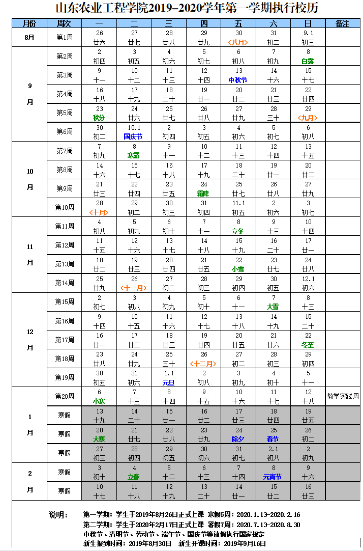2019—2020学年第一学期校历