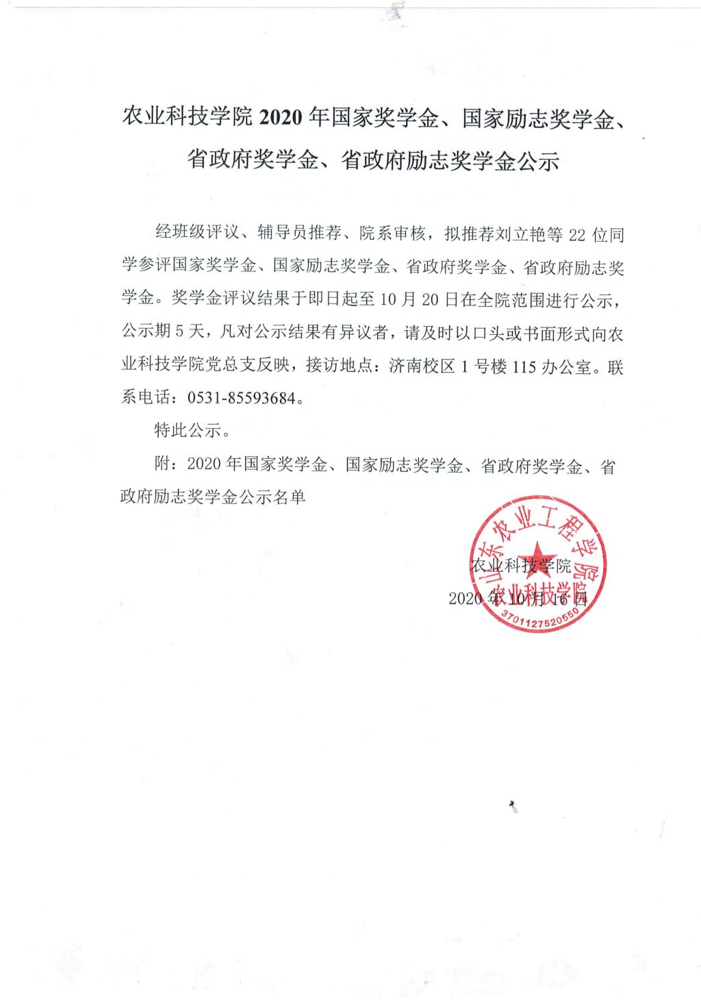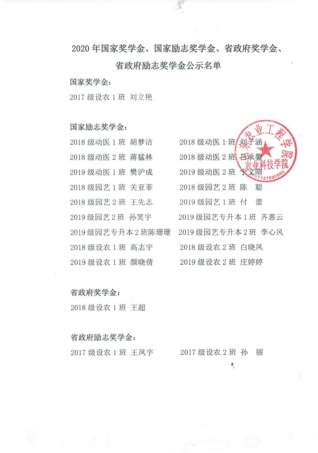 农业科技学院2020年国家奖学金、国家励志奖学金、省政府奖学金、省政府励志奖学金公示
