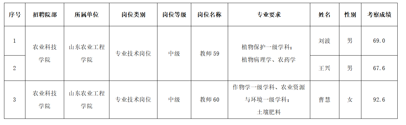 根据中共山东省委组织部、山东省人力资源和社会保障厅《关于印发2023年度省属事业单位公开招聘工作实施方案的通知》(鲁人社发〔2022〕23号)要求和《山东农业工程学院公开招聘工作实施细则》相关要求,按照岗位招聘计划和工作程序,我院已组织完成了2023年高层次人才公开招聘(第二批)直接考察工作,现对应聘人员考察结果进行公示。公示期为7个工作日,自2023年6月30日至2023年7月10日(不含节假日)。公示期间,如对公示人选有异议,请及时向学院反映,公示结束无异议,按照岗位招聘计划等额组织政审体检。