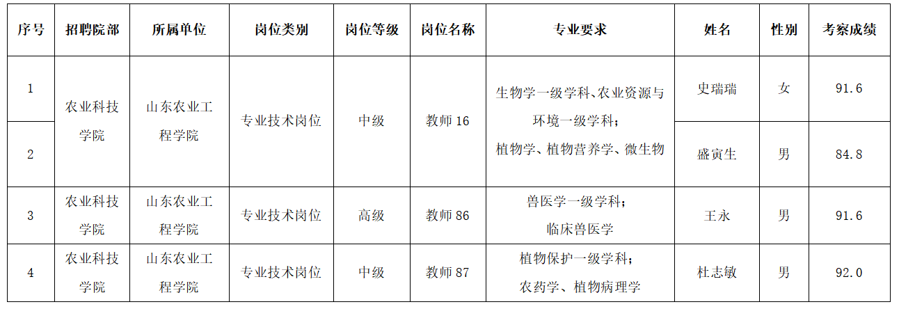 根据中共山东省委组织部、山东省人力资源和社会保障厅《关于印发2023年度省属事业单位公开招聘工作实施方案的通知》(鲁人社发〔2022〕23号)要求和《山东农业工程学院公开招聘工作实施细则》相关要求,按照岗位招聘计划和工作程序,我院已组织完成了2023年公开招聘(第三批长期招聘)直接考察工作,现对应聘人员考察结果进行公示。公示期为7个工作日,自2023年7月24日至2023年8月1日(不含节假日)。公示期间,如对公示人选有异议,请及时向学院反映,公示结束无异议,按照岗位招聘计划等额组织政审体检。