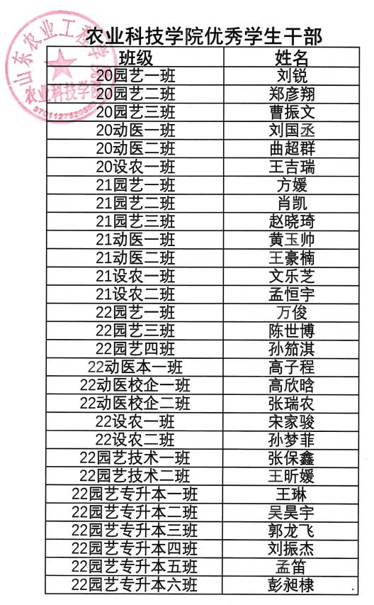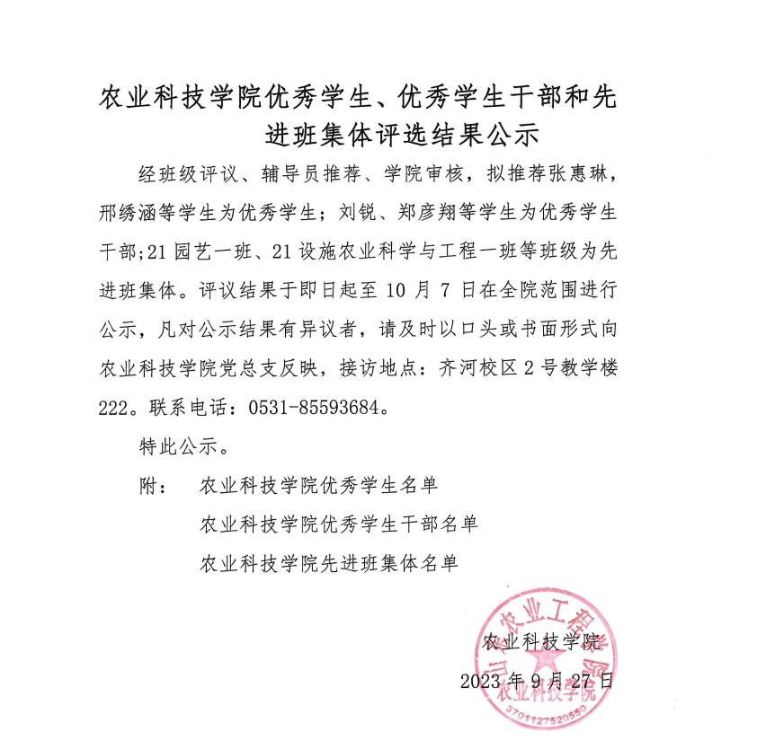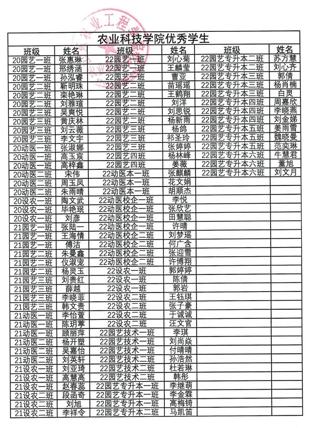 农业科技学院优秀学生、优秀学生干部和先进班集体评选结果公示