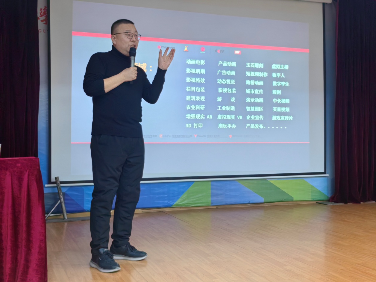 12月22日下午,在济南校区1号教学楼5楼多功能厅,北京完美动力集团学术总监、青岛完美动力数字科技有限公司总经理邹永涛应邀为我院师生进行了一场别开生面的专题讲座。本次讲座主题为《影视动漫就业指导及AIGC生成对职业规划的影响》,由艺术学院副院长安明明主持,艺术学院数字媒体艺术专业部分师生聆听了本次讲座。