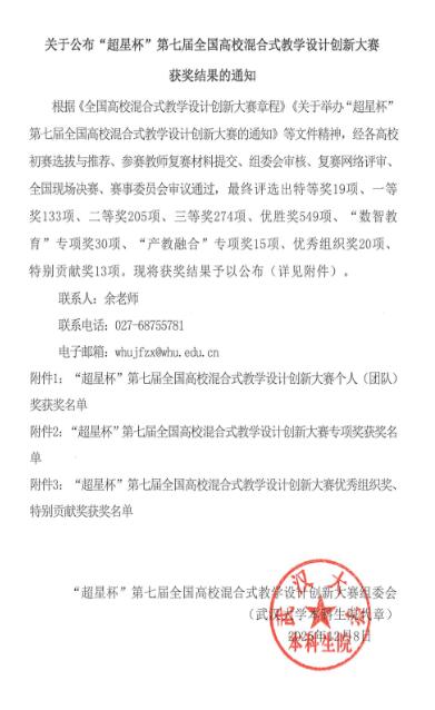 近年来,学校持续推进混合式教学改革,通过教师培训、平台支持与机制建设,鼓励教师开展教学创新,提升课程质量。全国高校混合式教学设计创新大赛被纳入中国高等教育学会《全国普通高校教师教学竞赛分析报告》统计源,是衡量高校教师教学发展水平的重要指标之一。我院将以此次赛事为契机,进一步总结推广优秀教学经验,为全面提升人才培养质量、推动高等教育内涵式发展注入新的动力。